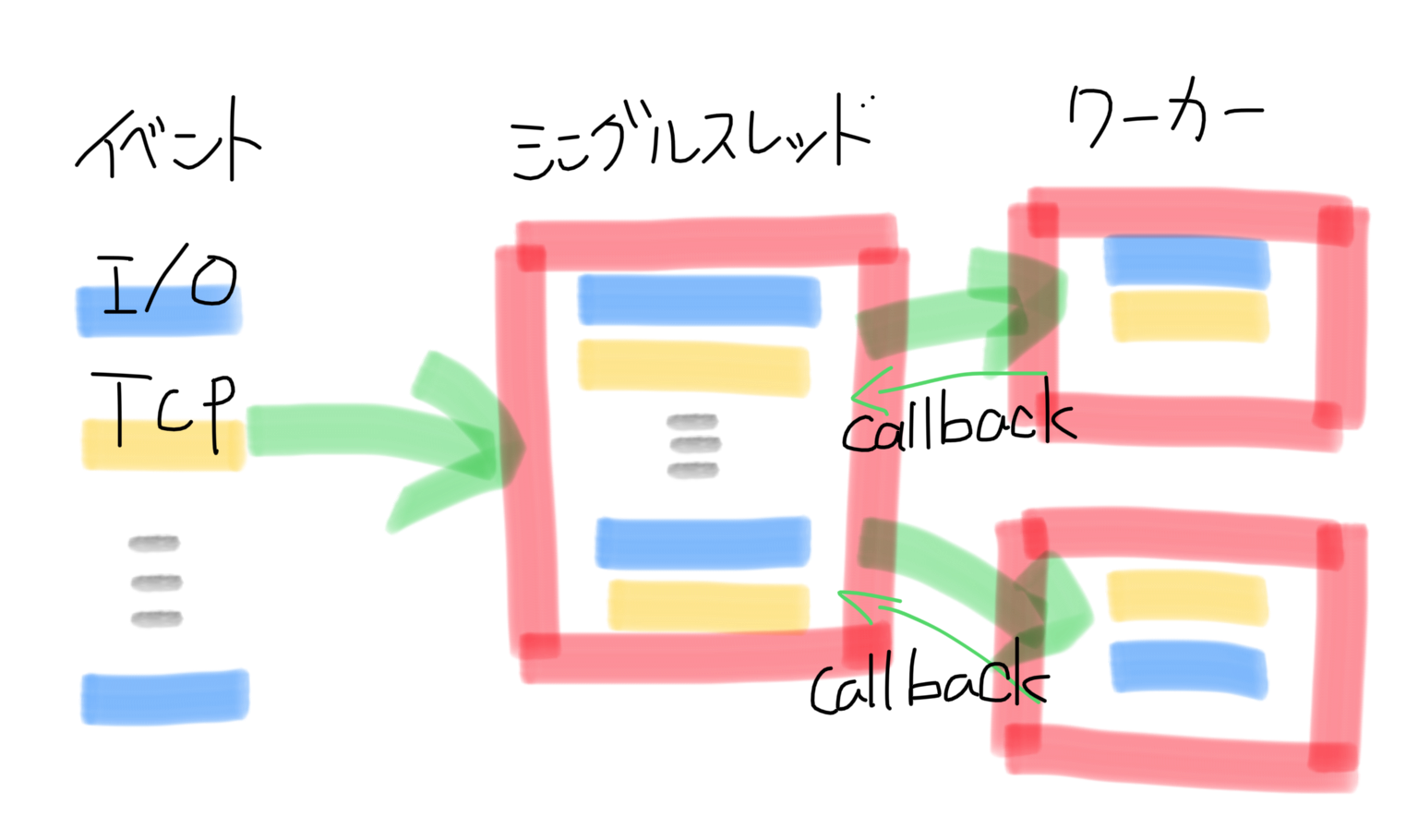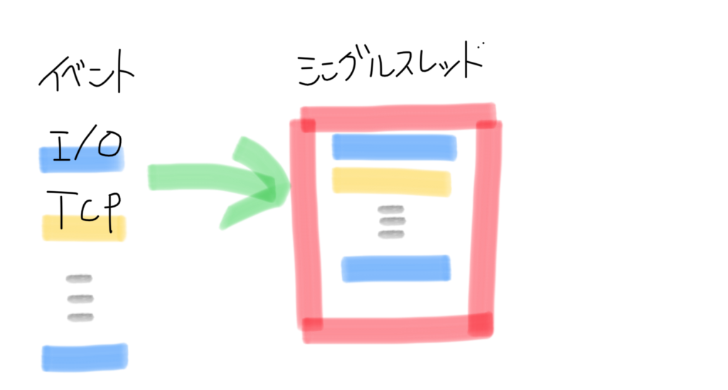 Node.jsのイベントループモデルは、シングルスレッドでひたすらにイベント(I/Oとか通信とか)を受け付け続ける(いわゆる無限ループ)