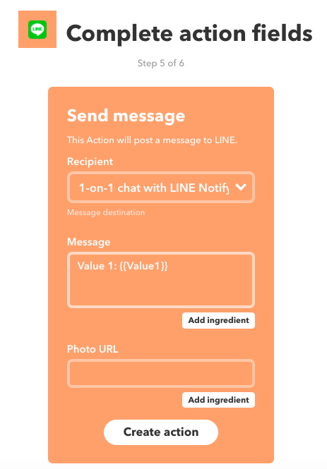 あとMessageの内容ですが上の写真のような構成だとLINEの通知の際に、「Value1:何かのメッセージ」といった形式になります。