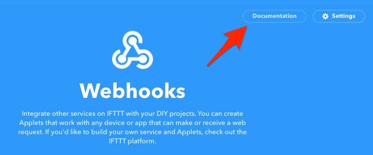 そうすると、Webhooksの設定やドキュメントなどが参照できる画面に遷移するので、そこの右上のDocumentationをクリックします。